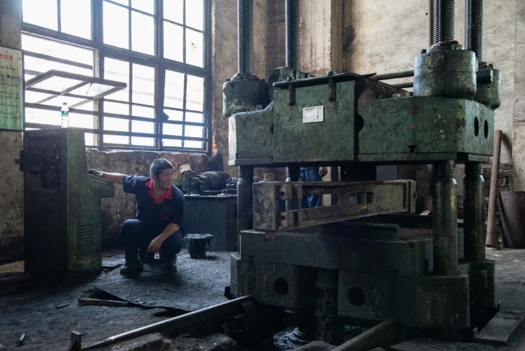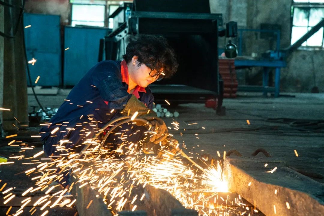 电焊工吴风英正在配合钳工修理支架底座里面的推拉杆。