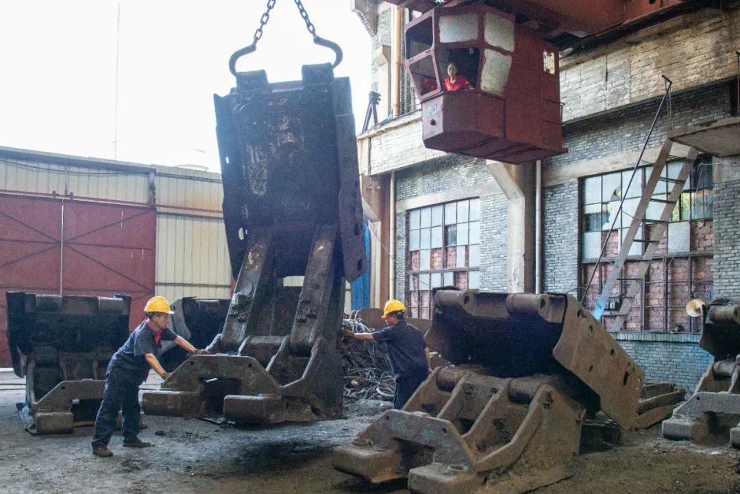 职工夏海煜和熊雄协助行车操作员曹香珍将清洗好的综采支架统一摆放整齐。